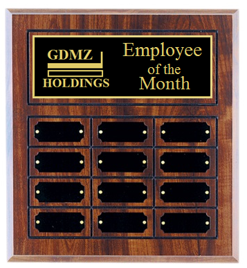 This Perpetual Employee of the Month Plaque is exactly what your office or workplace needs.  The plaque includes 12 customizable plates, free logo integration, and completely complimentary initial engraving.  If no logo is applicable the information on the header plate may be centered accordingly.