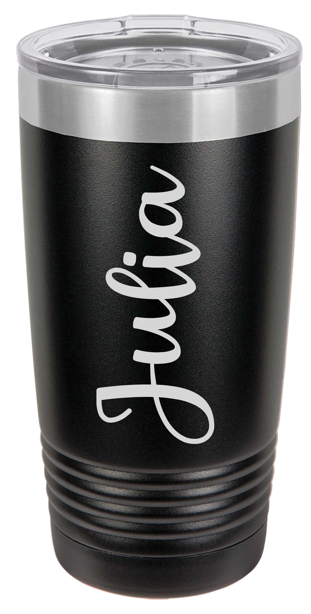 Black 20oz. Polar Camel Tumbler. Double-Wall Vacuum Insulation for increased cold and hot retention. A top seller and must-have this Polar Camel Tumbler is available with a variety of laser engraved styles. Each unit includes a clear lid with precision fit gasket to eliminate spilling. Product images are representations of what your final product will look like, this product is laser engraved. The experts at Custom Den laser through the powder coating, exposing the stainless steel underneath.