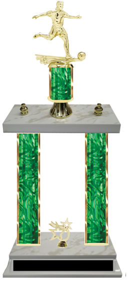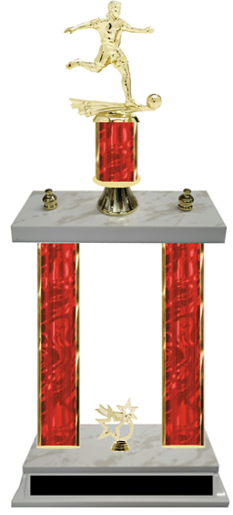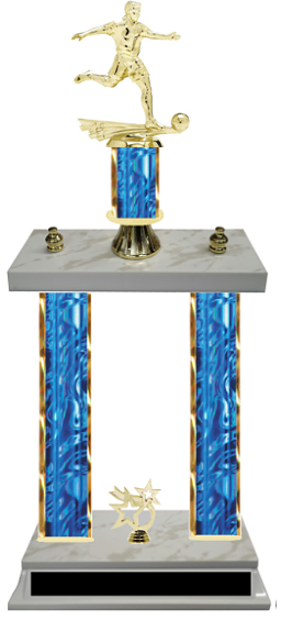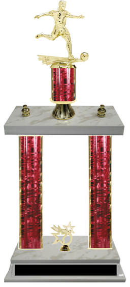 Double Column Boy's Team Soccer Trophies that are perfect for soccer tournaments and team functions.  Choose your color, choose your size, and customize yours today with our complimentary engraving plates